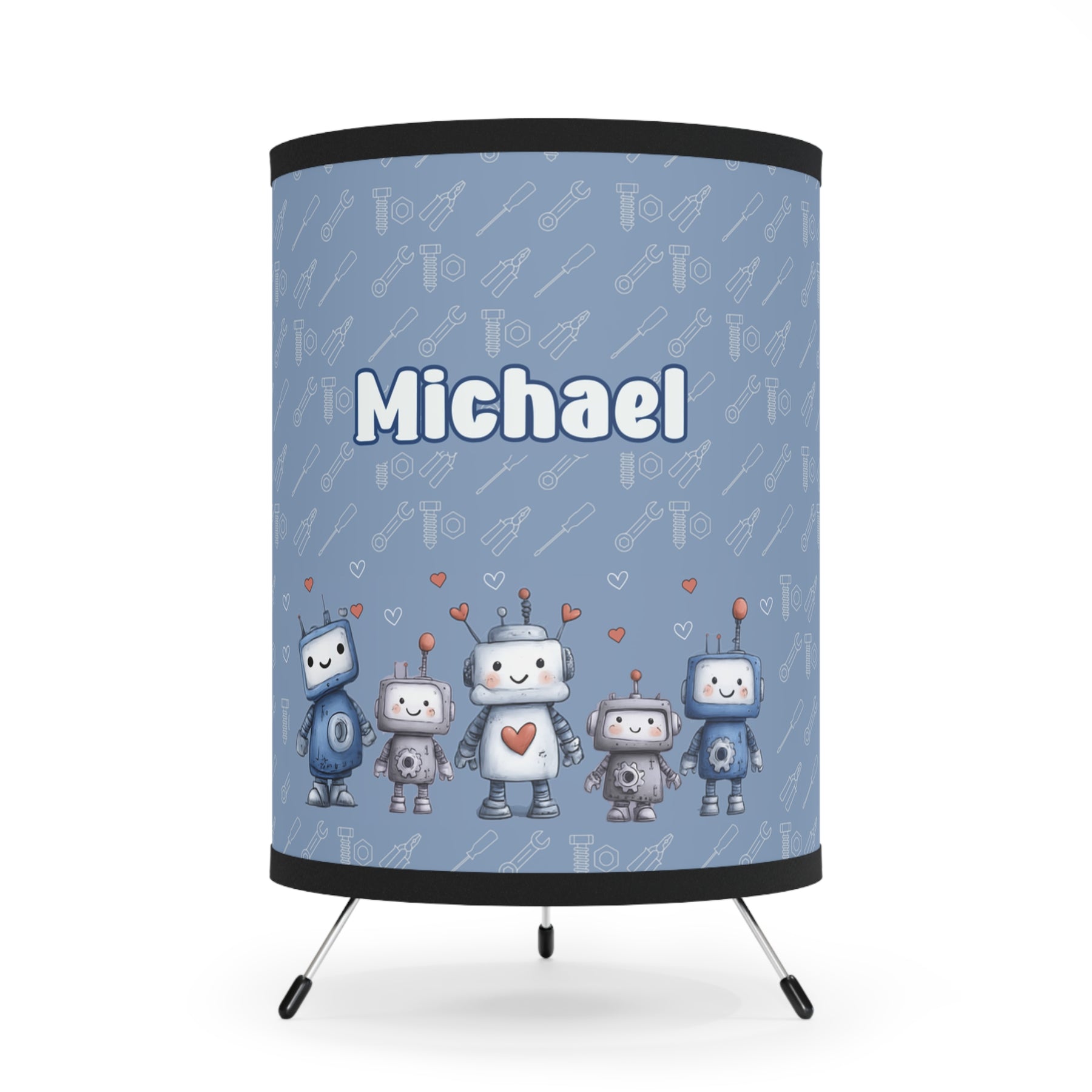 Brighten up your little one’s space with this adorable robot-themed tripod lamp, custom-made just for them! Featuring a playful row of smiling robots and your child’s name in bold, fun lettering, this lamp brings both function and charm to any nursery or boy’s bedroom.