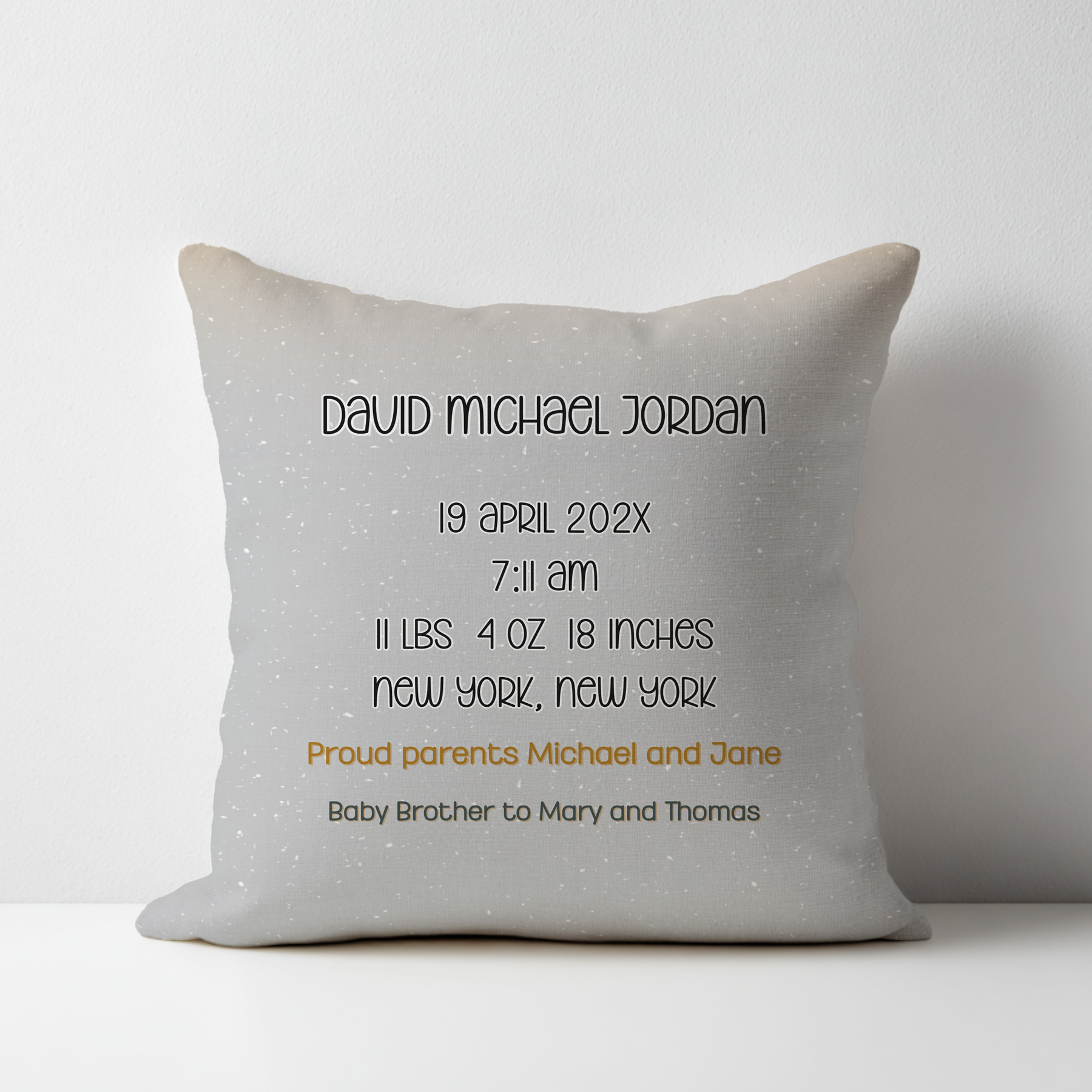 Create a cozy, meaningful space with our custom baby pillow covers, thoughtfully designed to add warmth, charm, and personality to your little one’s nursery. Made from soft, high-quality polyester, this personalized nursery pillow cover offers a gentle, comfortable texture that’s perfect for decorating baby rooms, children’s bedrooms, playrooms, and cozy reading corners.