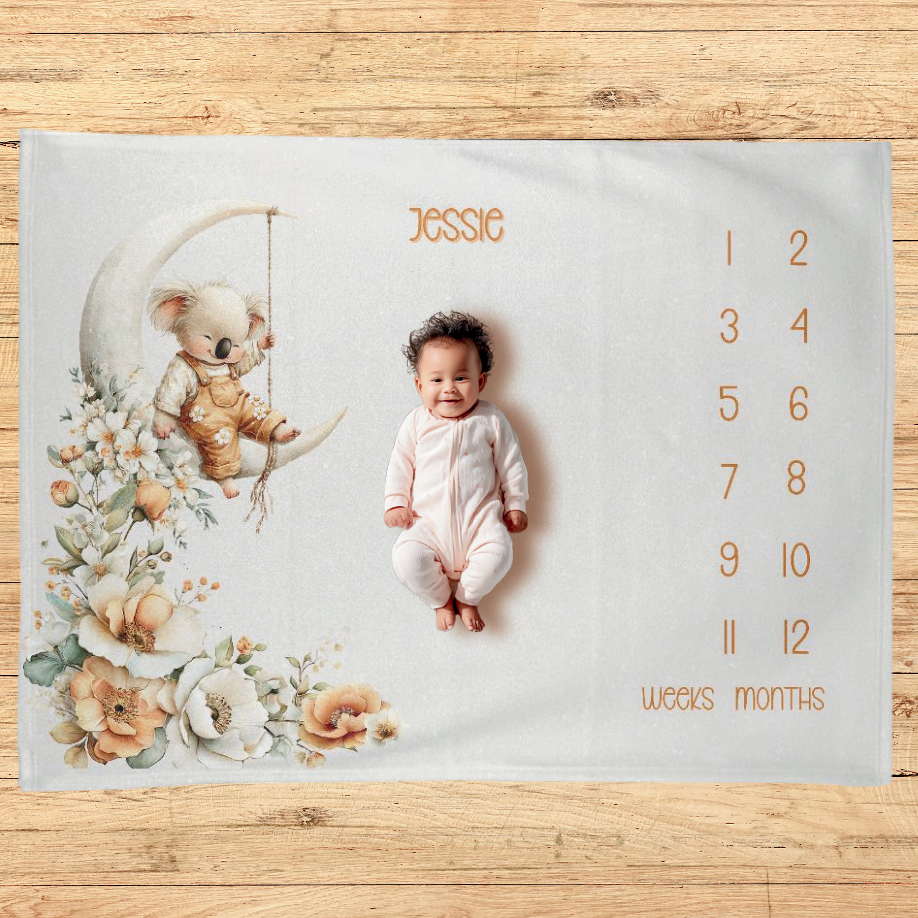 Celebrate your baby’s first year with this charming koala floral milestone blanket. Thoughtfully designed to create cozy, photo-ready moments, this personalized set blends gentle florals, adorable koala details, and timeless comfort—perfect for capturing milestones and adding warmth to your baby’s nursery.
