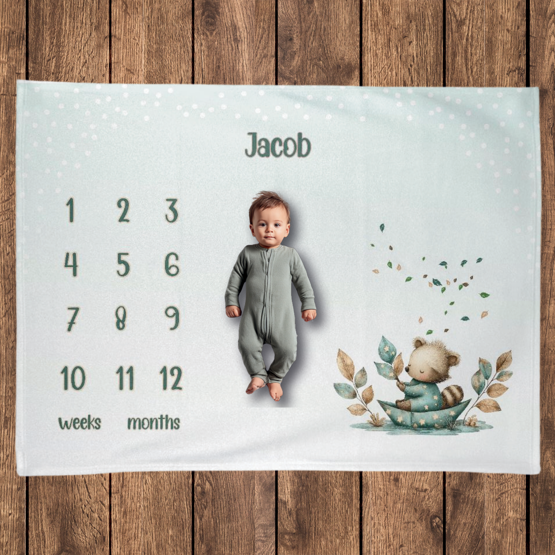 Personalized raccoon in a boat milestone blanket with custom baby name. A whimsical storybook nursery keepsake for milestone photos.
