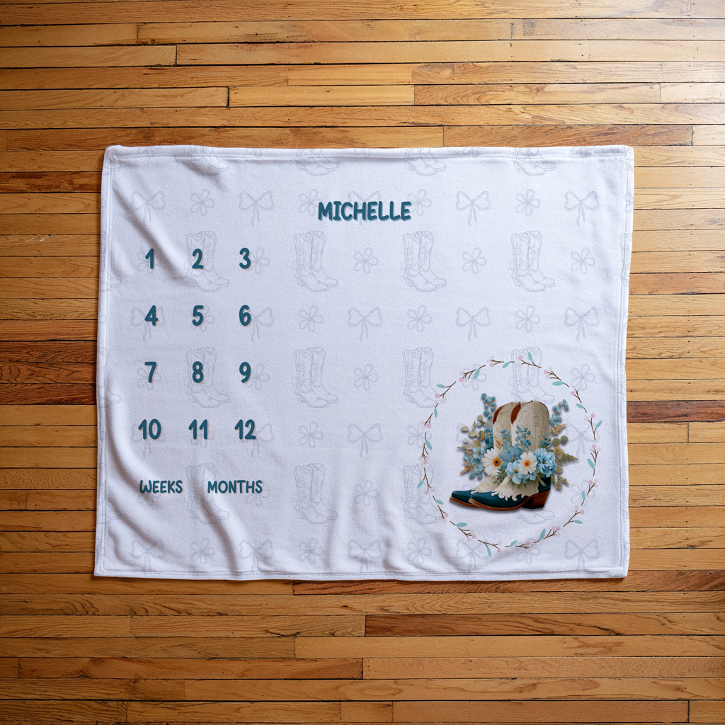 Personalized floral cowgirl milestone blanket with custom baby name. A trendy western keepsake for nursery decor and photos.