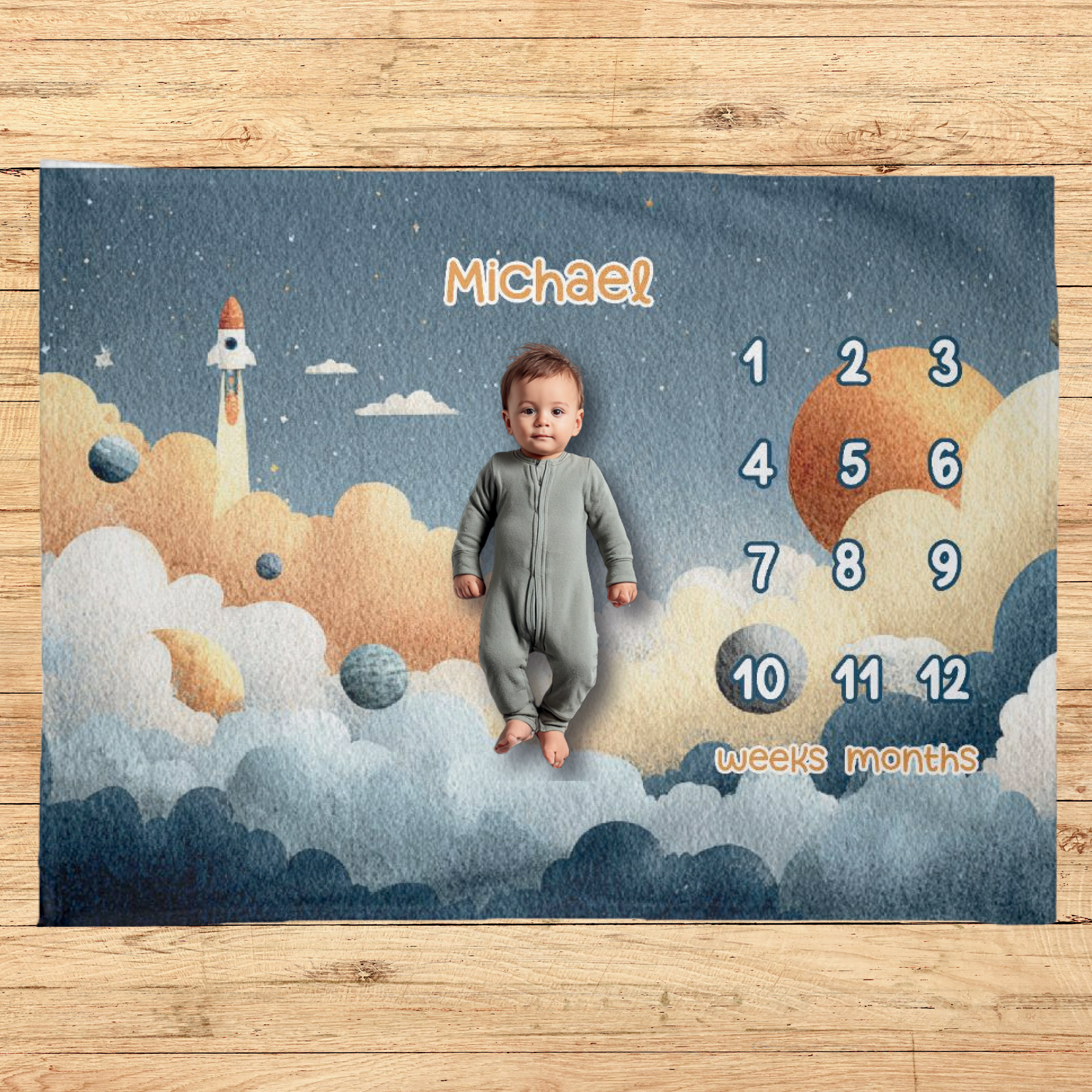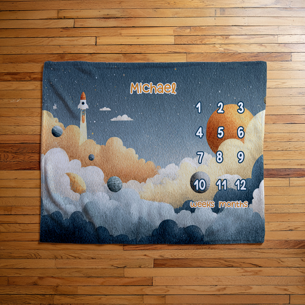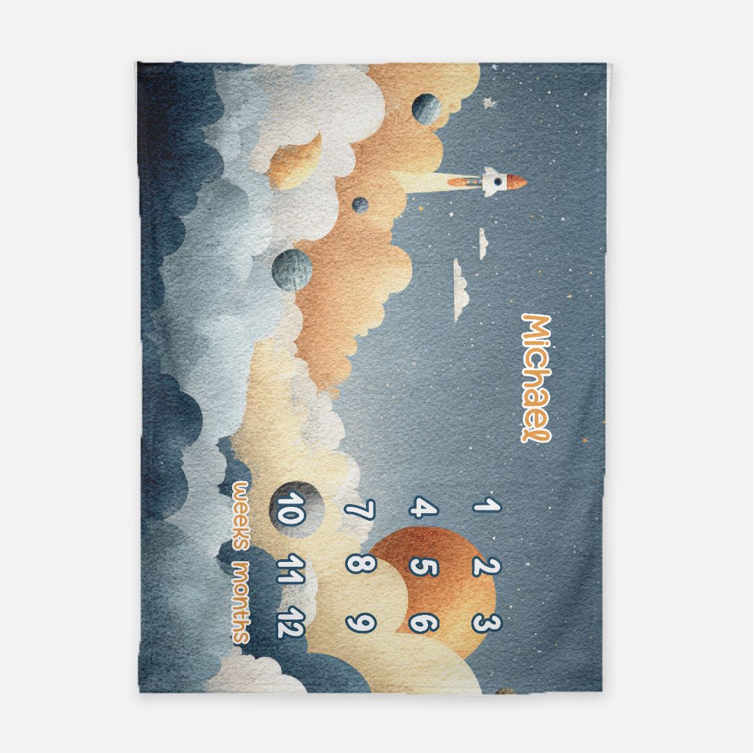 Personalized spaceship outer space milestone blanket with custom baby name. A fun, adventurous nursery keepsake for milestone photos.