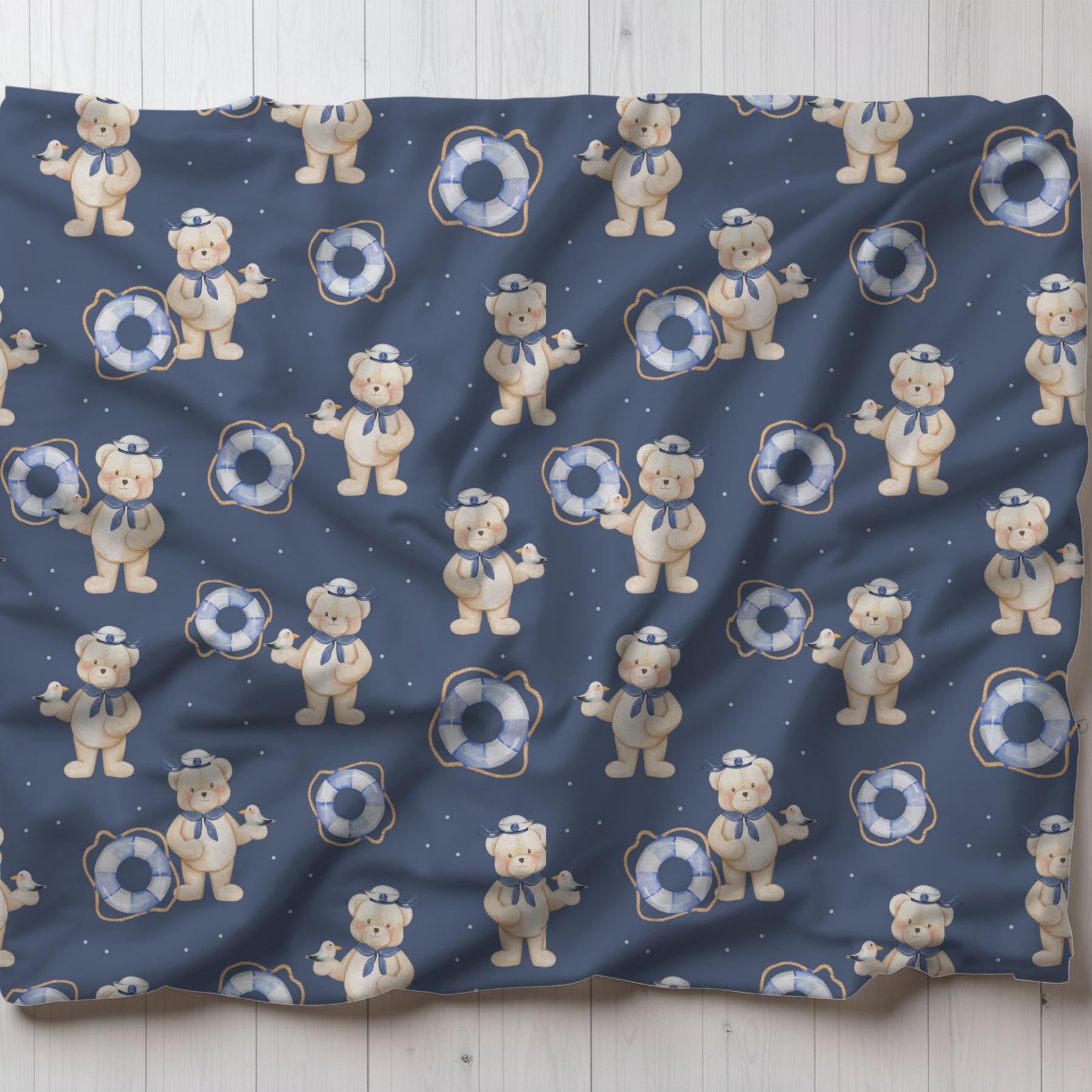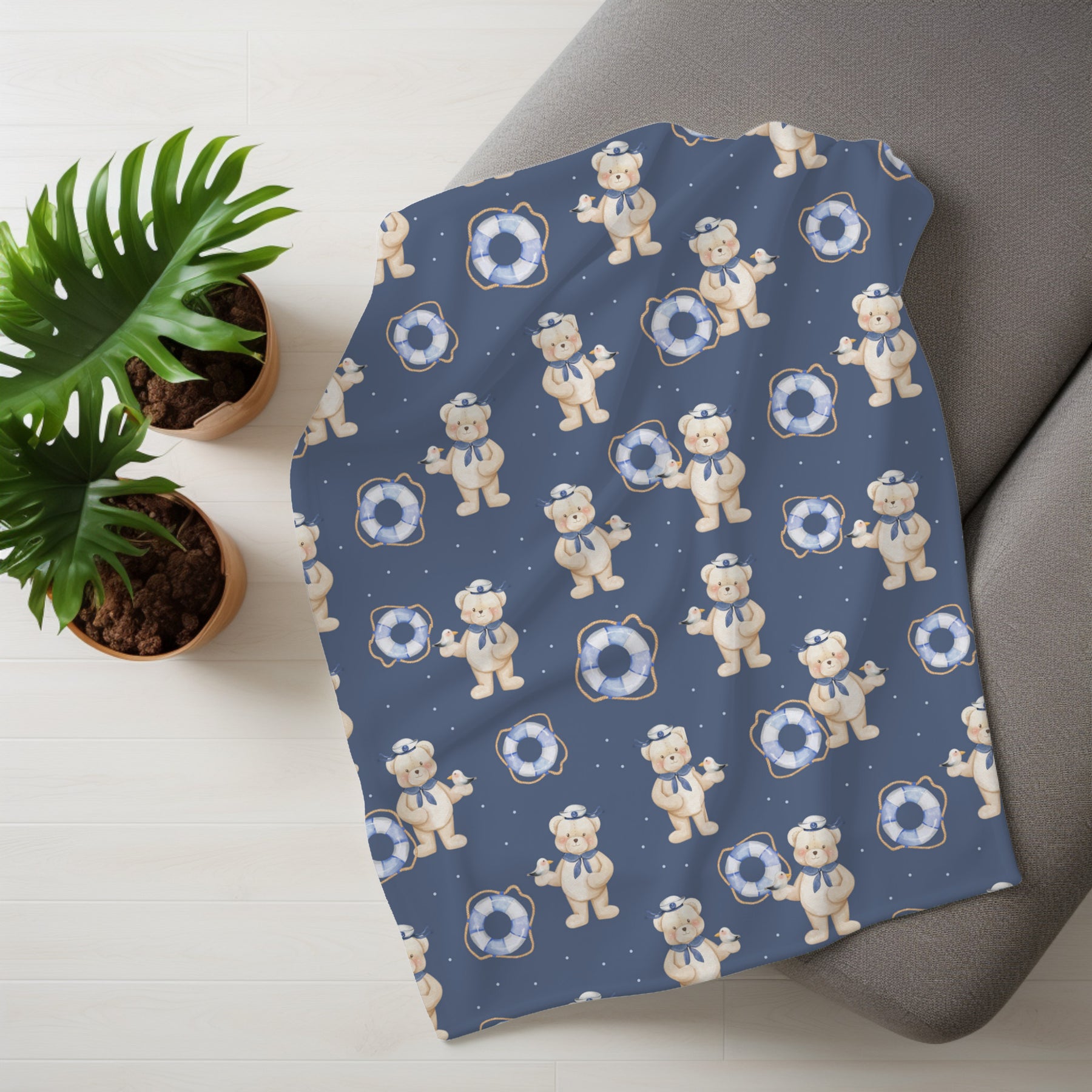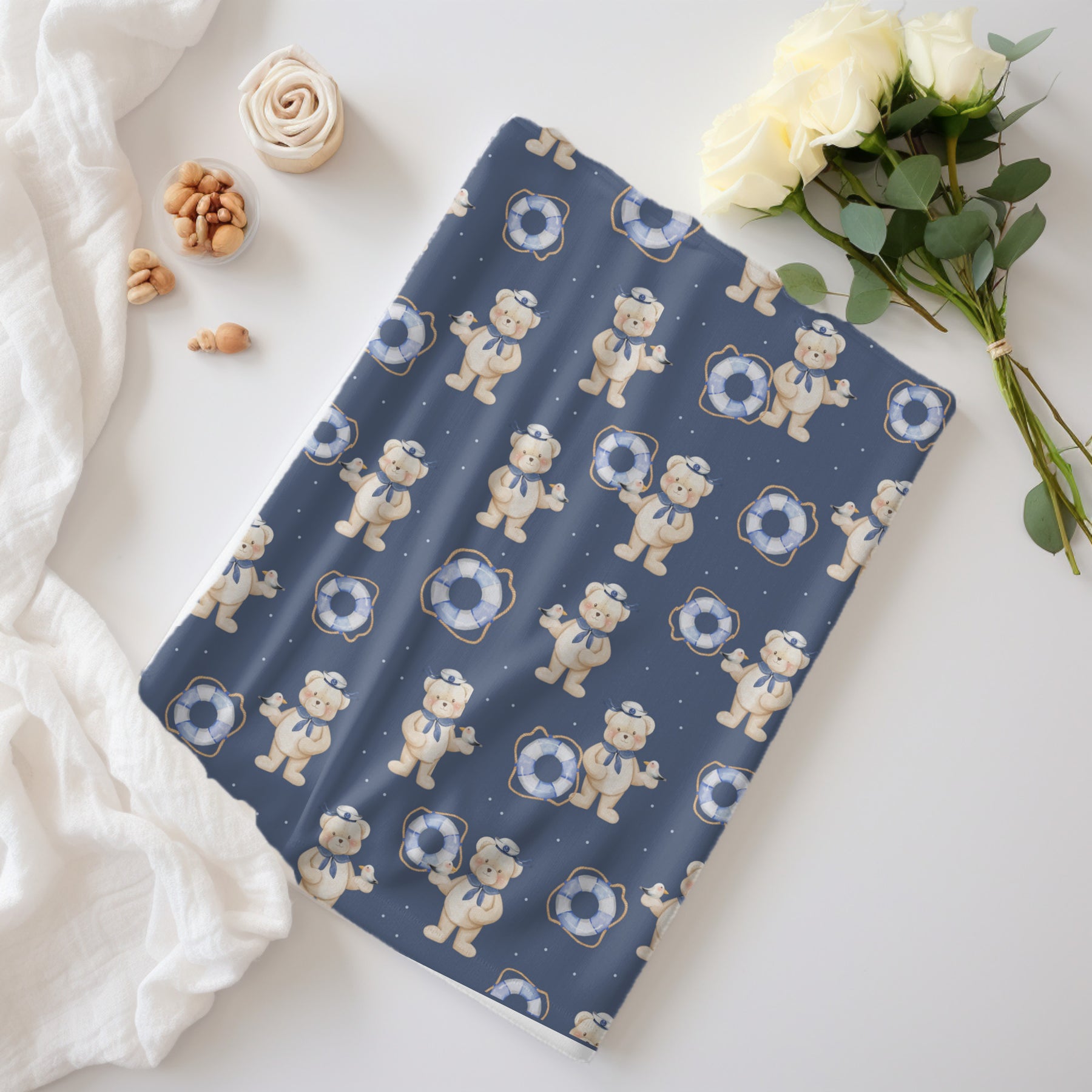 Let your little one set sail on a sea of dreams with the adorable and cuddly Teddy Bear Sailor Swaddle Blanket. This blanket is perfect for swaddling newborns and infants, helping them to feel secure and comfortable. It's also luxuriously soft and warm, making it ideal for snuggling up on the couch or for bedtime. Large size of 42 x 42 inches.