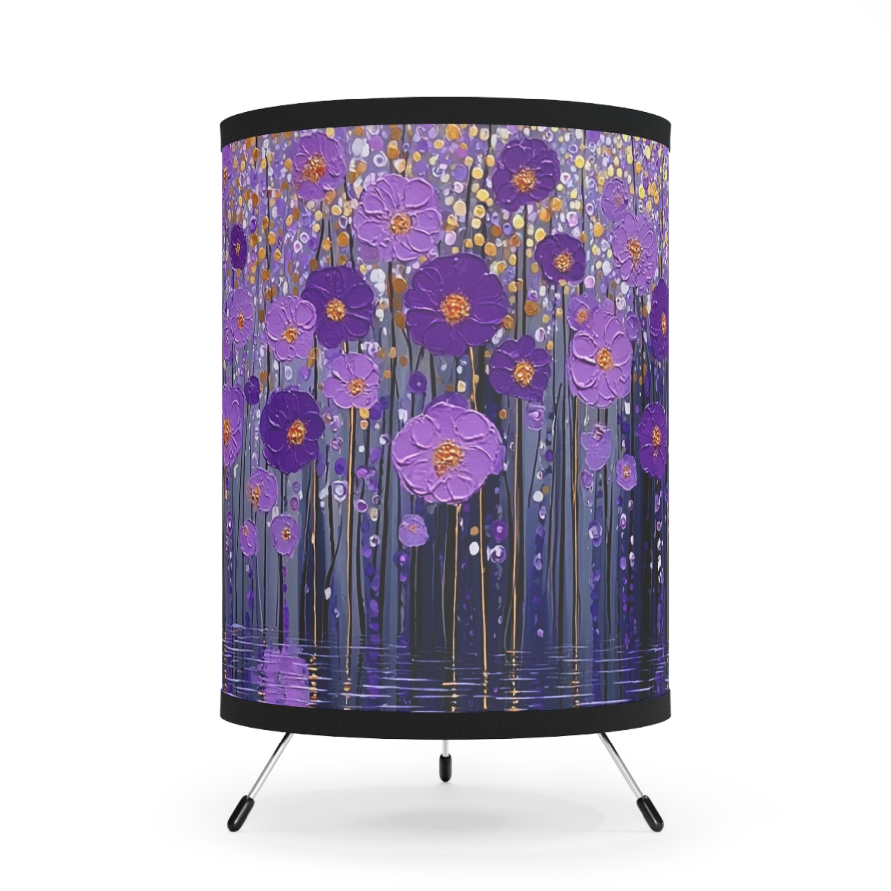 Warm, artful lighting that turns a room into a quiet, contemplative corner. This tripod lamp pairs a high-resolution printed shade—brimming with painterly purple blooms and soft golden accents—with a slim galvanized steel tripod base. When lit, the polyester-trimmed shade diffuses a cozy, warm glow that makes the floral artwork feel alive and gently reflective. It suits bedside nooks, creative studios, or living spaces where atmosphere matters. Simple to set up with a Type A plug for US/CA outlets and compatible with CFL, incandescent, or LED bulbs (not included).
