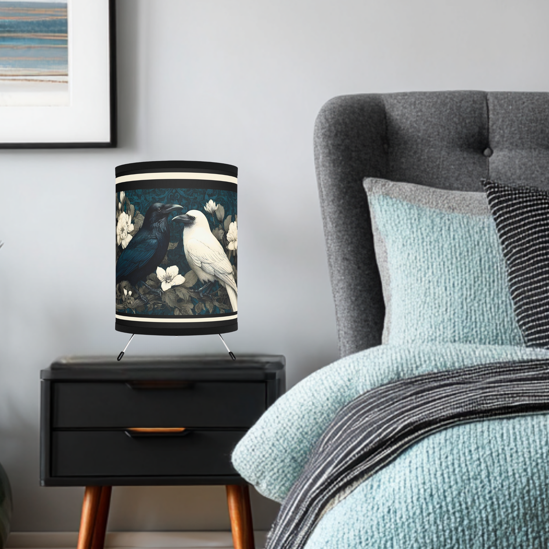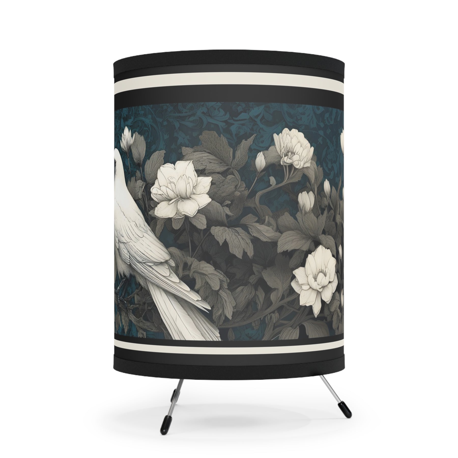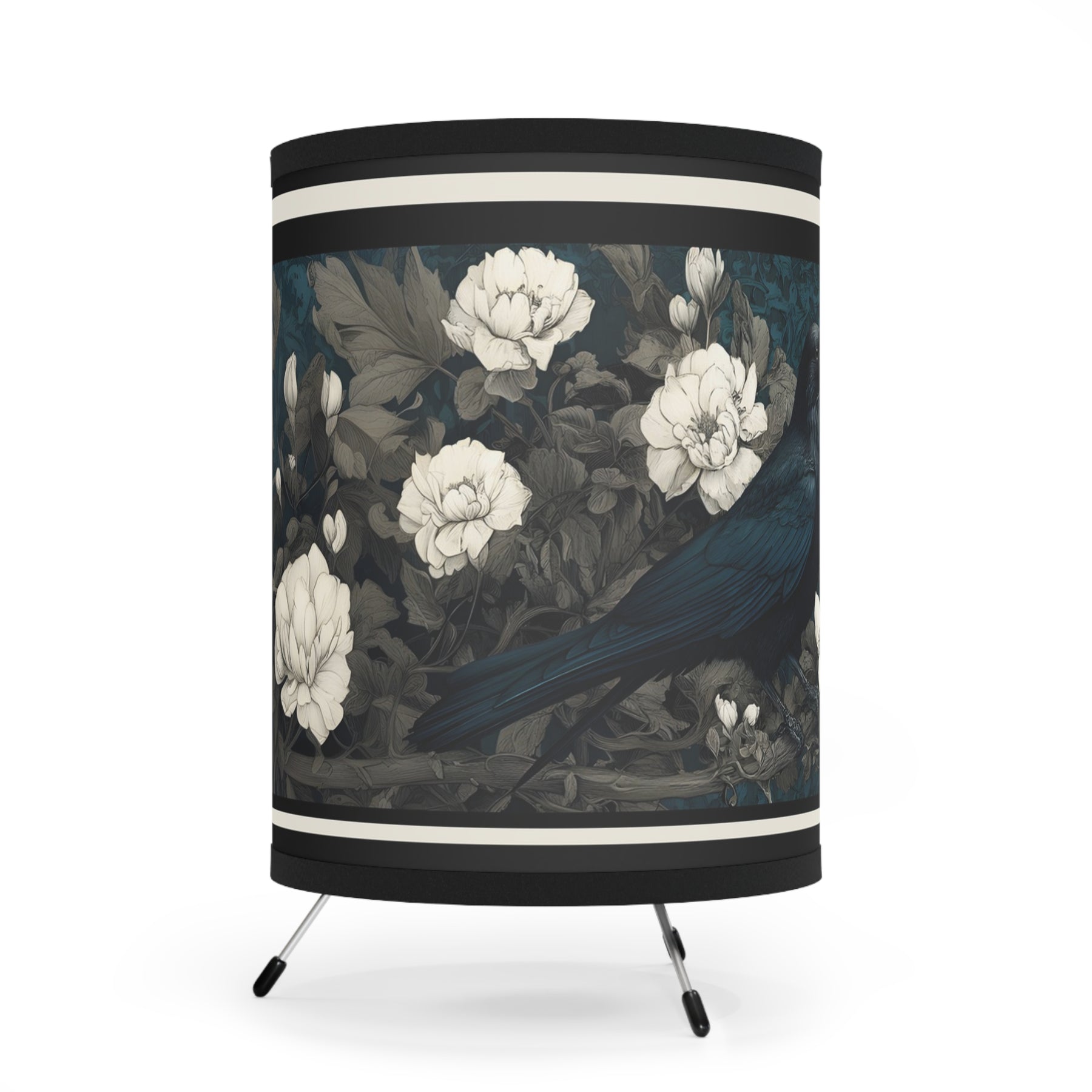 Soft, moody light meets detailed art. This tripod lamp pairs a galvanized steel three-leg base with a high-resolution printed polyester shade that wraps your room in a quiet, evocative scene — two birds nestled among vintage-style blooms in deep teal, black and ivory tones. Switch it on to bring warm, cozy illumination that highlights the print’s textures and muted palette. It sits low and intimate on a side table, nightstand or bookshelf, creating a contemplative corner for reading, sketching or late-night playlists. For people who collect melancholic art or curate dark-accented interiors, this lamp feels like a small museum piece that also makes your space feel lived-in and personal.