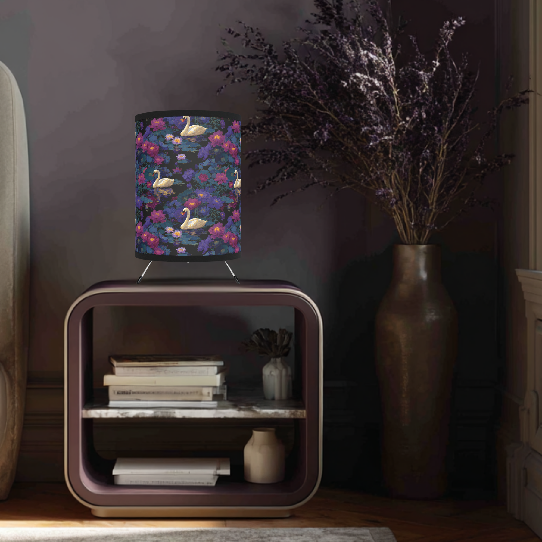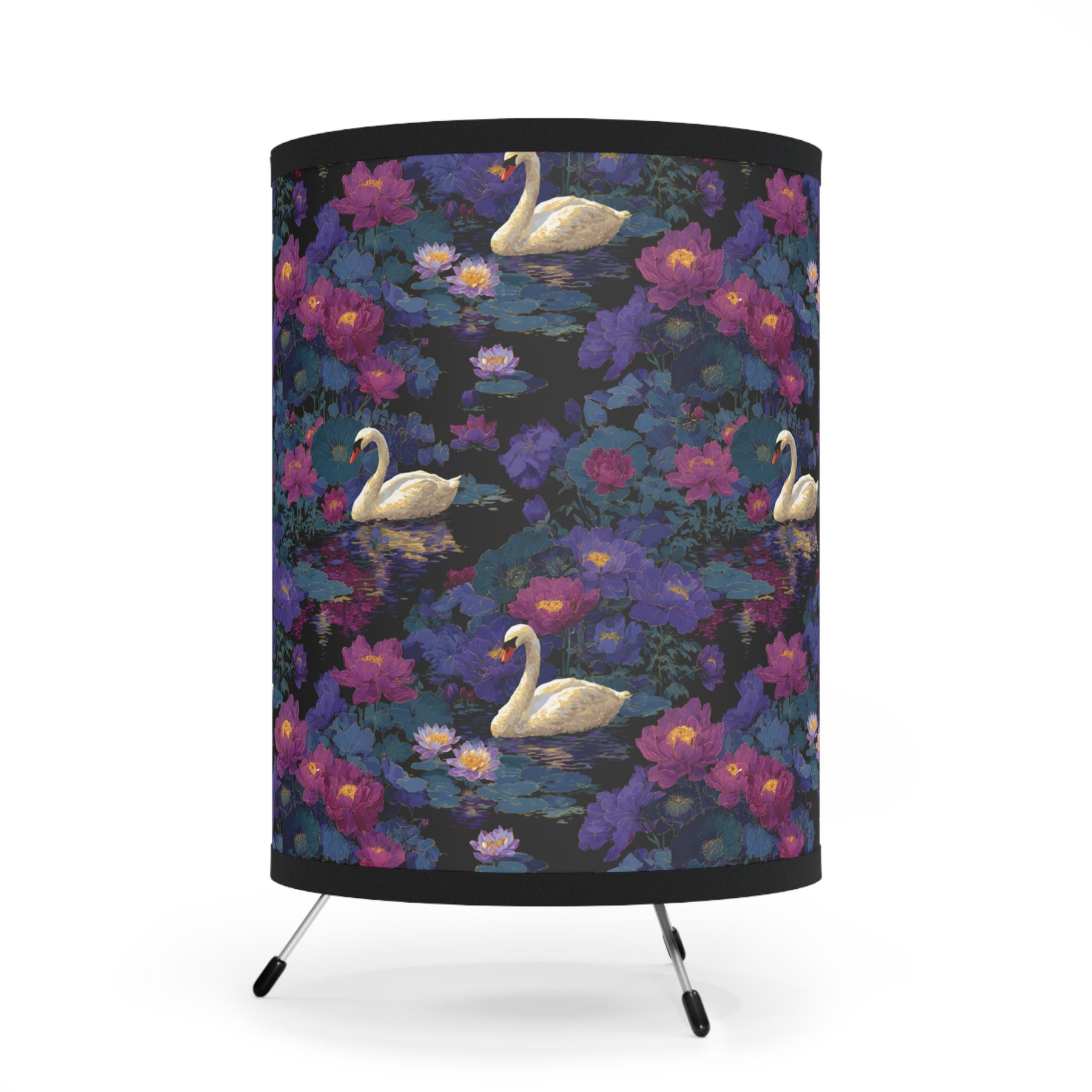 Soft pools of color, drifting lilies, and the quiet arc of a swan — this tripod lamp brings a painterly, late-evening pond into your room. The high-resolution fabric shade wraps the scene in rich purples, deep blues, and warm highlights; when lit it mellows into a cozy, intimate glow that invites reading, reflection, or slow conversation. The slim galvanized tripod keeps the silhouette airy and modern while the printed shade becomes the room’s little landscape. Place it beside a reading chair, on a bedside table, or near a window to add calm, romantic depth to your daily rituals or to set a gentle mood for small gatherings.